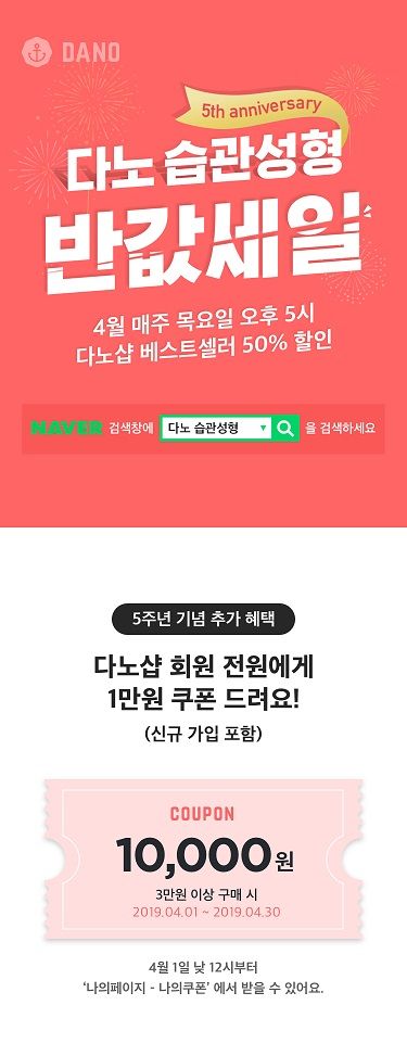 신규 및 기존 회원에게 1만원 할인쿠폰을 제공하고, 매주 목요일 오후 5시부터 다노샵 대표 제품 1종씩 50% 할인 판매하는 행사다.