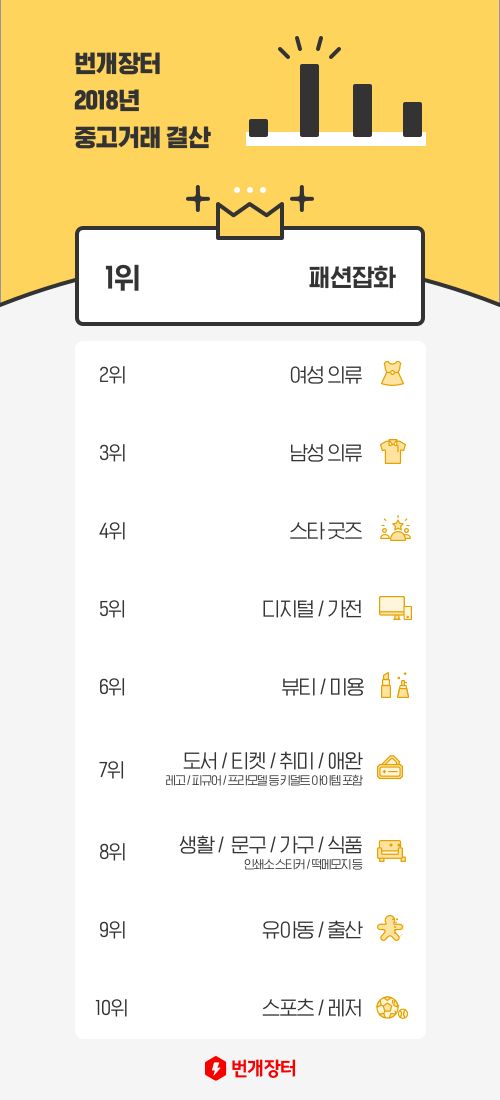 모바일 중고마켓 번개장터(대표 장원귀)는 지난해 품목별 거래량 분석 자료를 토대로 ‘2018 번장 인기 거래품목 TOP 10’를 선정했다고 4일 밝혔다.