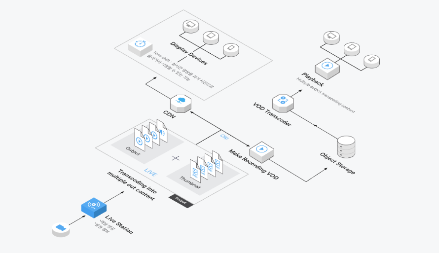 다량의 콘텐츠를 많은 사용자에게 버퍼링 없이 빠르게 전달해주는’CDN(Content Delivery Network)’과 녹화된 영상을 저장하는 ‘Object Storage’ 및 비디오 파일을 다양한 형태로 빠르게 변환할 수 있는’VOD Transcoder’ 등과 함께 복잡한 설정 없이 빠른 서비스 구축과 확장을 지원한다.