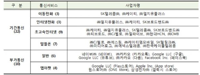 올해 이용자 보호업무 평가는 이용자 규모와 민원발생비율 등을 고려해 이동전화, 인터넷전화, 초속인터넷, 알뜰폰, 앱마켓, 일반 부가 통신서비스 등 6개 서비스분야, 총 32개 회사가 대상이다. 서비스 분야 중복을 제외하면 22개 회사다.
