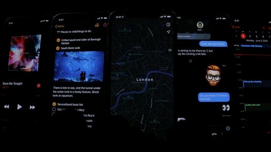 iOS 13은 맥OS 모하비(버전 10.14)에 먼저 도입되었던 다크 모드를 아이폰에도 가져왔다. 주위 배경 색을 어둡게 만들어 콘텐츠에 집중할 수 있고 OLED 디스플레이의 전력 소모를 줄이는 효과도 있다.