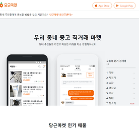 (사진 출처 : 당근마켓 홈페이지) '당신 근처에서 만나는 마켓'이라는 뜻을 가진 중고 물품 직거래 플랫폼이며 소프트뱅크 벤처스, 카카오벤처스, 스트롱벤처스로부터 총 57억원 투자 유치에 성공 참여한 벤처스 : 소프트뱅크 벤처스, 카카오벤처스, 스트롱벤처스 2015년 7월에 판교에서 시작한 4년이나 된 앱 기반 서비스 플랫폼이며 처음 사명은 '엔사십이', 판교 근처에서만 직거래가 가능했으나 분당 지역으로 확대 이후 2016년 케이큐브 벤처스, 캡스톤파트너스, 스트롱벤처스로부터 총 13억원을 투자 유치하면서 회사명을 '당근마켓'으로 바꿈 거래상의 위험을 줄이기 위해 동네 인증, 매너 평가, 거래 후기 등의 신뢰도 평가 시스템을 도입한 매너 온도 점수를 도입하여 입소문이 퍼짐 작년 10월에 다운로드 누적 1..